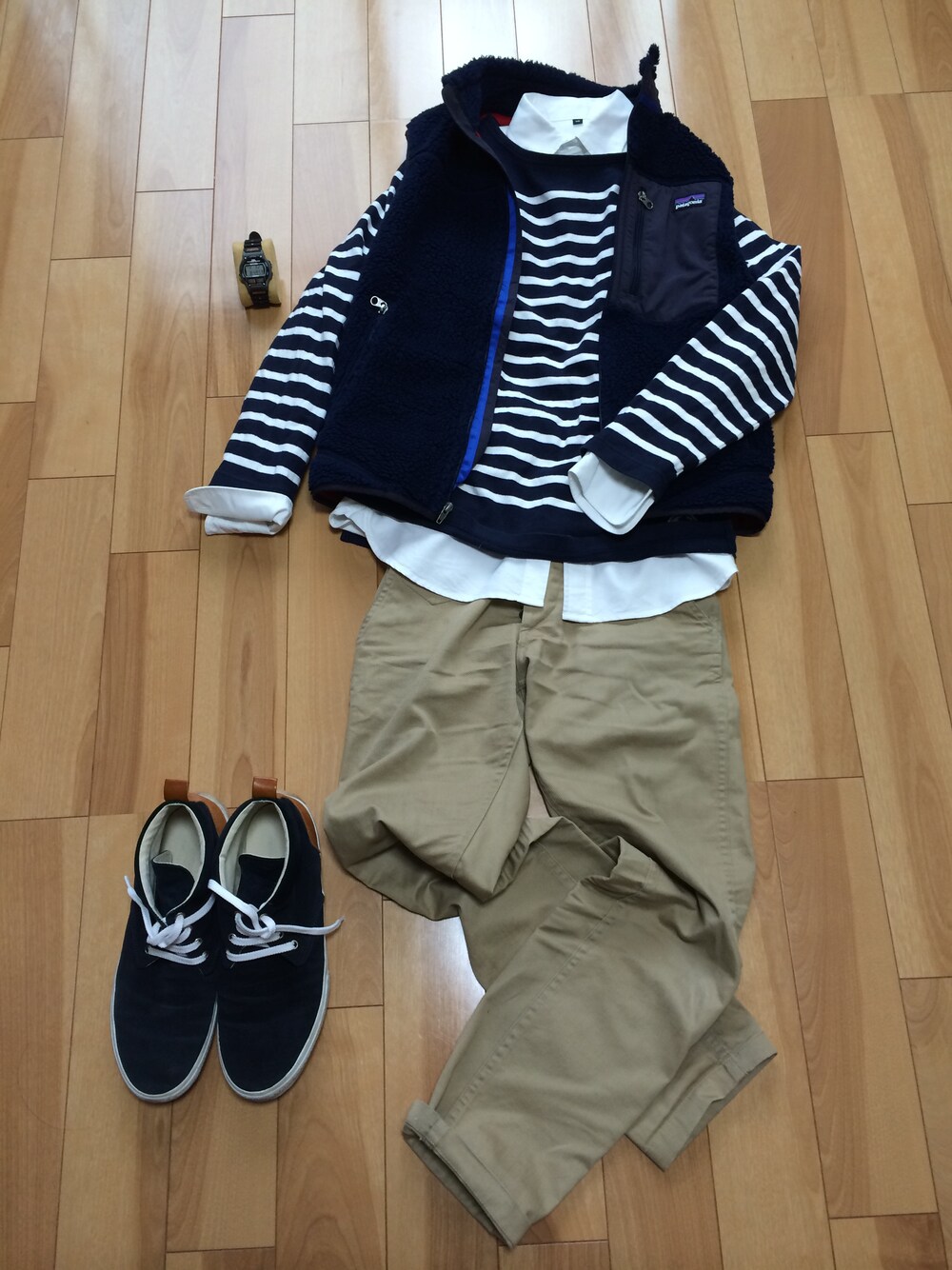 ボーダー柄のコーディネートです ボーダー柄のバスクシャツは定番アイテムなので、長く着ていけそうです。 チャッカスニーカーはブーツとスニーカーの間に位置するアイテムです。 見た目ブーツではき心地はスニーカーなので、雨や冬場で歩く時はオススメです。