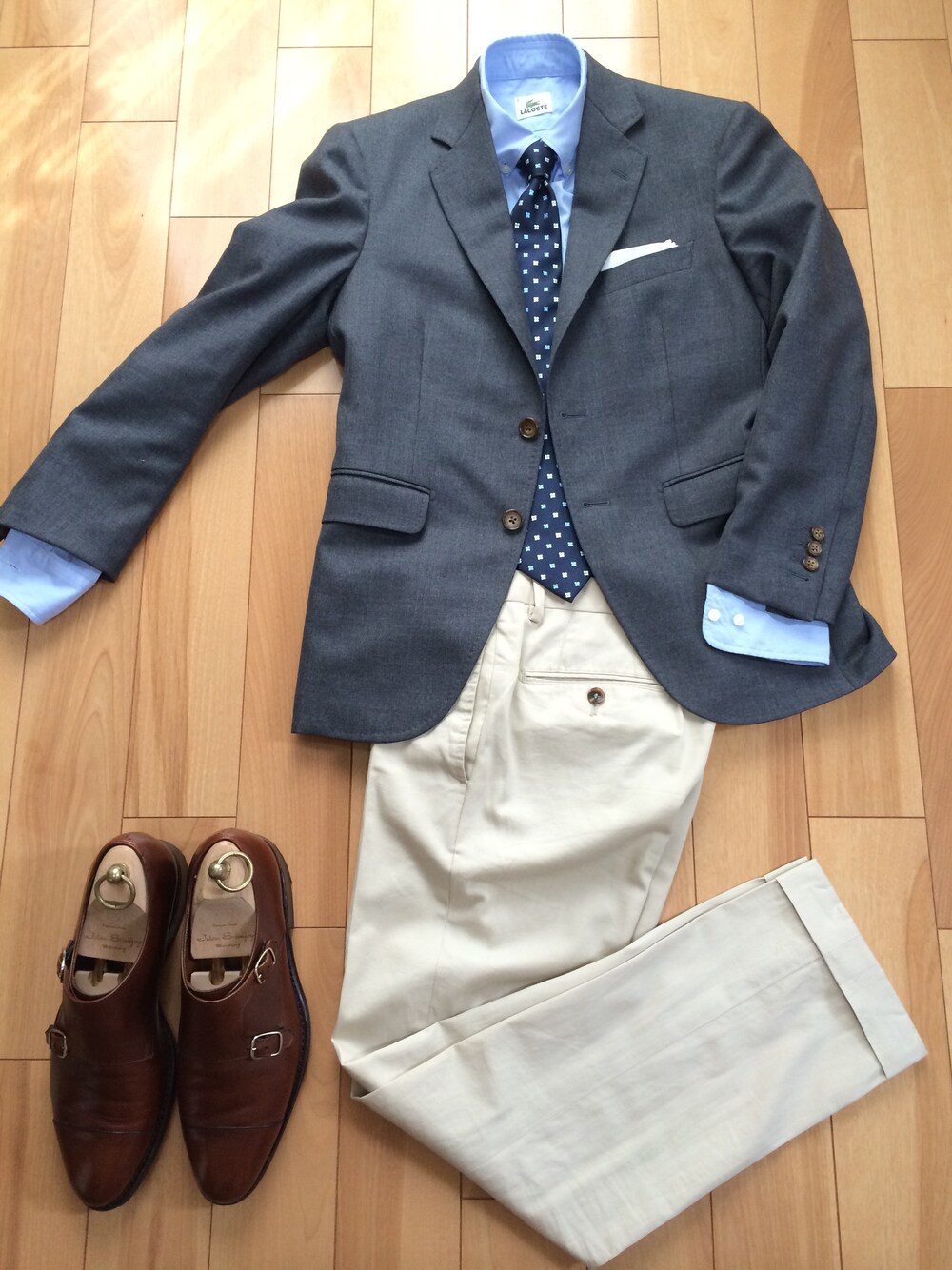 グレージャケットで、ジャケパンスタイルです 小紋タイはオリヒカで880円でした