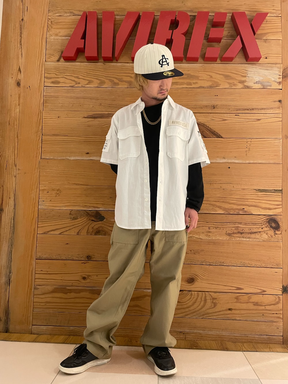 AVIREX町田店style ·身長:161cm ·着用サイズ: Tシャツ:M パンツ:M シャツ:L キャップ:7 1/2 ホワイト系のシャツとキャップにベージュ系のパンツで爽やかに決めました! シャツもワンサイズアップで涼しげな感じが◎ 東京都町田市原町田6-4-1 町田東急ツインズ イースト館3F TEL:042-728-2191 営業時間10:00〜20:00