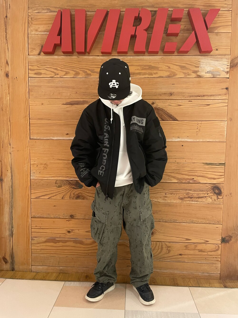 AVIREX町田店style ·身長:161cm ·着用サイズ: パンツ:M ジャケット:2XL パーカー:L コレクションMA-1着用です MA-1にカーゴパンツというミリタリー全開な組み合わせですがオーバーサイズ&パーカーでストリートコーデに! 街着にぴったり! 東京都町田市原町田6-4-1 町田東急ツインズ イースト館3F TEL:042-728-2191 営業時間10:00〜20:00