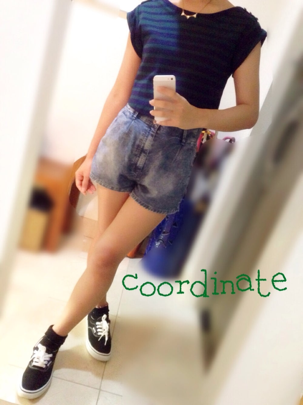 BBQのときのコーデ(^_^)☆ 分かりにくいですが、COCO DEALのトップスは 緑と紺のボーダーで肩にボタンが付いていて お気に入り。