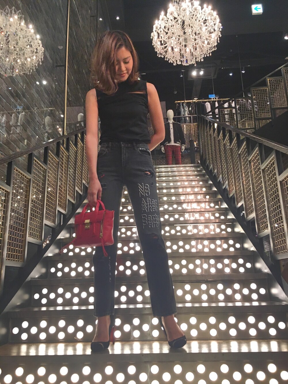 遊びゴコロのあるALEXANDER WANGのデニムはシルエット抜群!さし色に赤を入れたちょっぴり秋なモードスタイル!