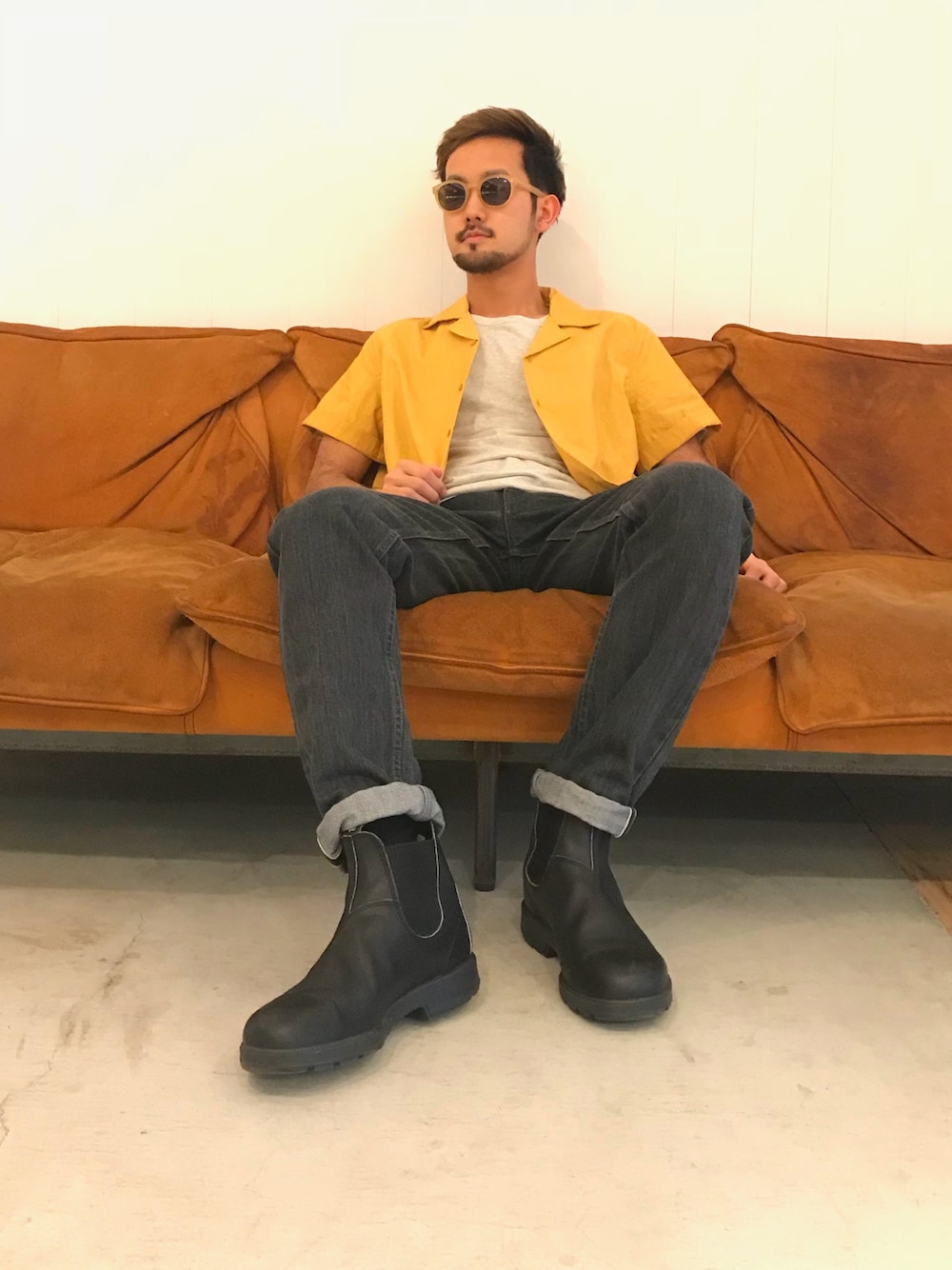 経年変化を楽しむスタイル🇺🇸 ガーメントダイ(製品染め)で染色したシャツをブラックデニム、ブーツの合わせで粗野なスタイリングに。 ガシガシ使い込んでお洗濯をして頂く度に色味の変化を楽しめます。 今回は一番メロウな感じに変化していきそうなイエローを選んでみました🌞 生地が馴染んで色褪せる過程を楽しむ。 メンズのファッションならでは楽しみ方だと思います👐🏿