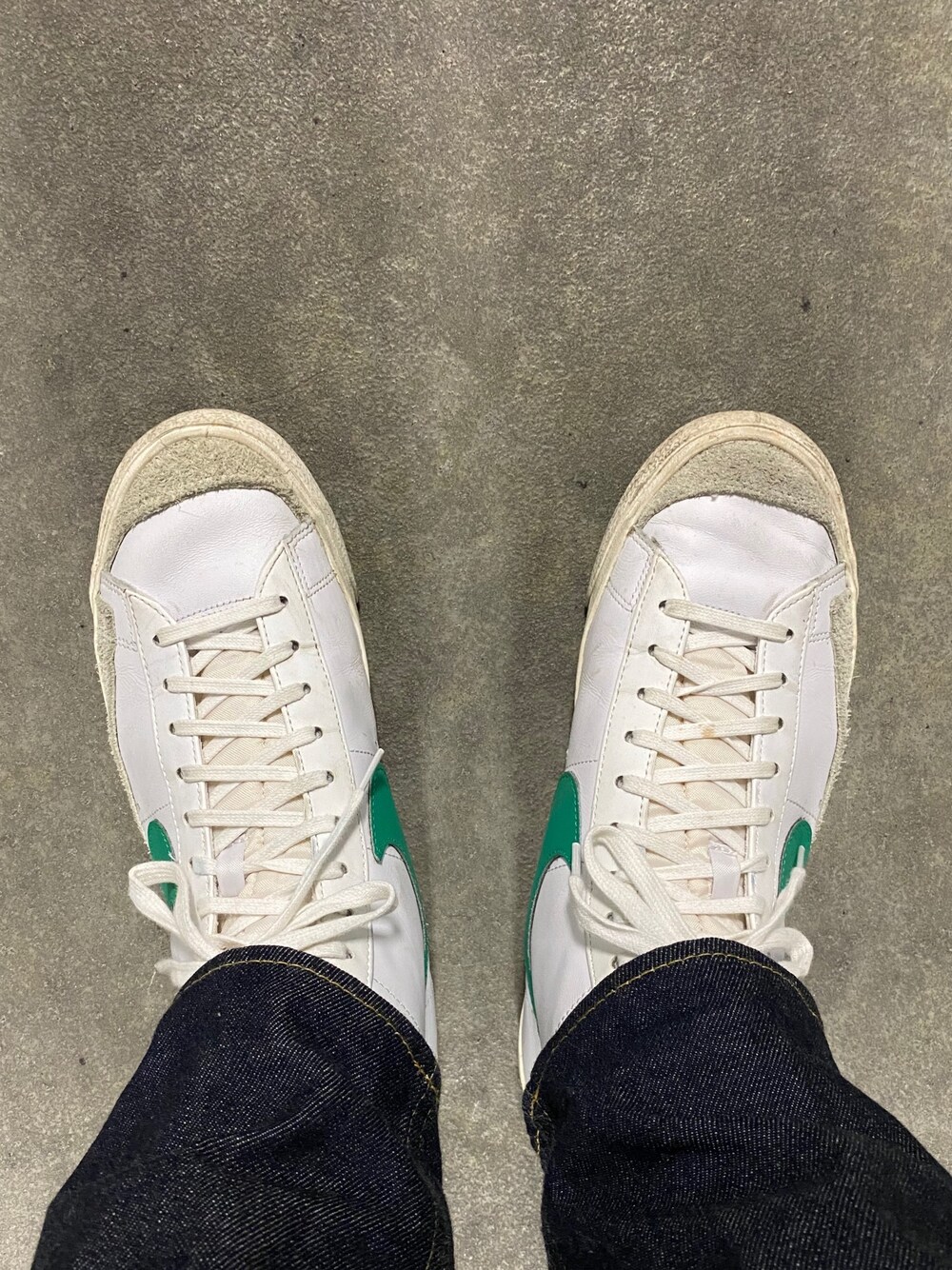 ホワイト系のスニーカー、ブルー系のデニムパンツを着用したメンズの冬コーディネートの1枚目の写真