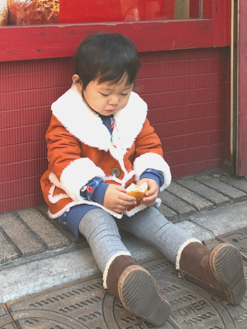 近所のパン屋さん🍞お店出てすぐココで食べると言い出したから、端っこで食べさせてもらったー! コートは半額でお得に買えたよっ😊 アウターいくつもあっても仕方ないし、汚れてもいいやーと保育園(一時保育)用に買ったんだけど、保育園の先生から汚れちゃうからとNGもらったやーつ! みんなどんな洋服着て保育園行ってるのかしら…