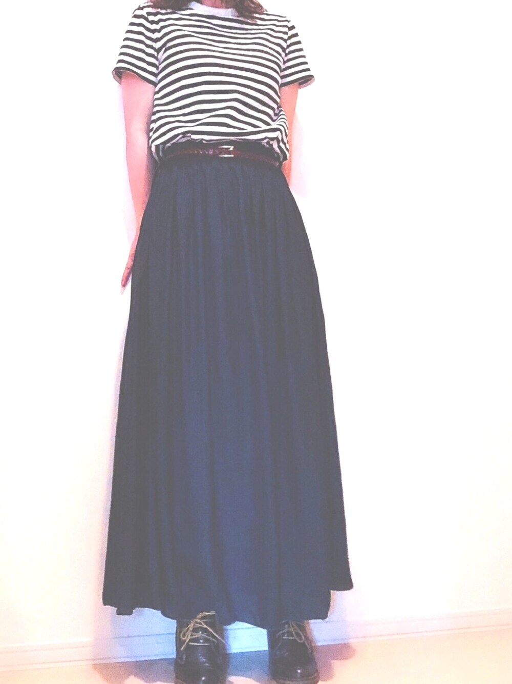 今日もオフ 着心地の良い好きなボーダー✖︎サテンのロングスカート 5センチのブーティ合わせて少しきちんと感プラス