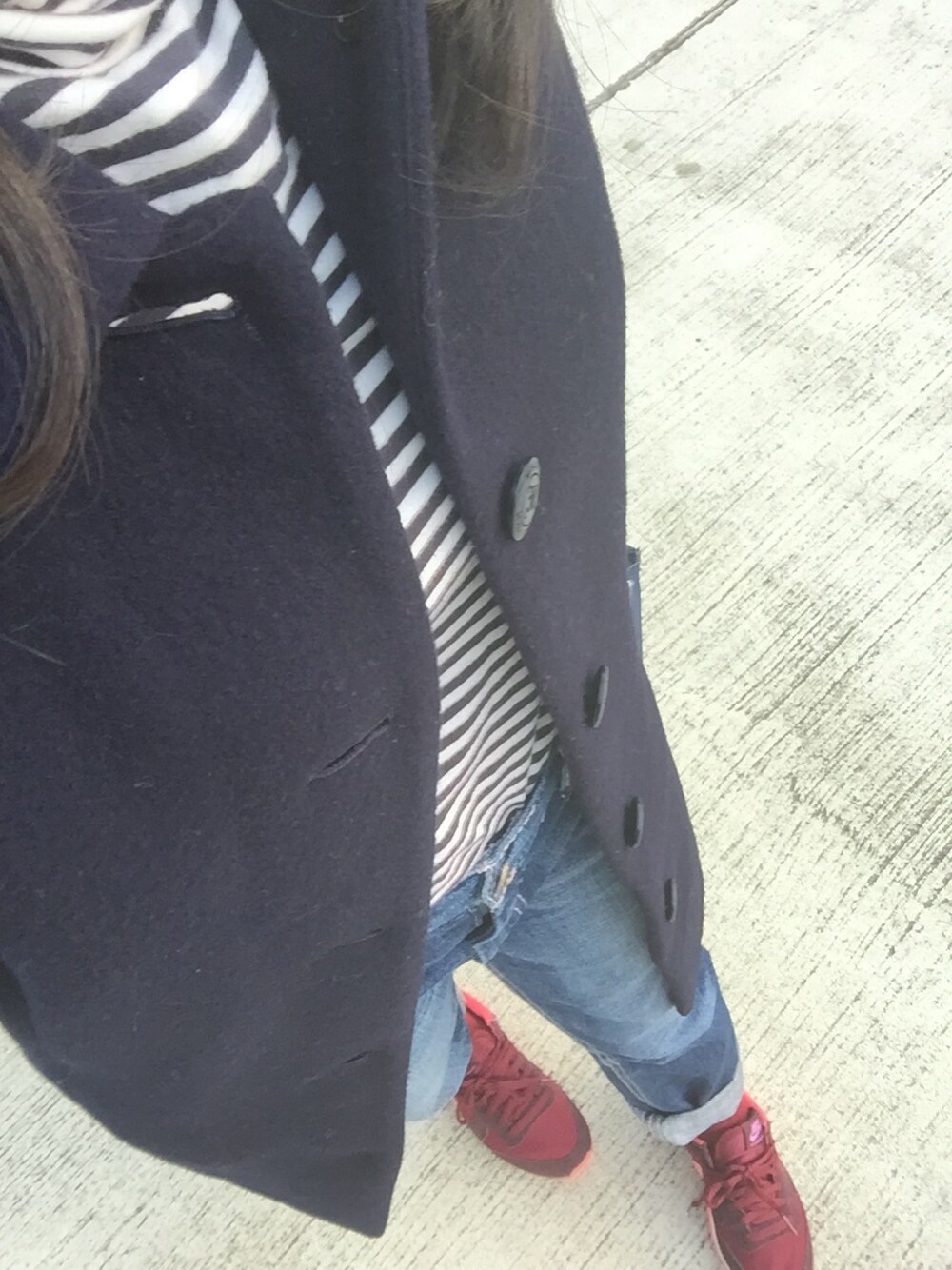 レッド系のスニーカーを着用したレディースの冬コーディネートの1枚目の写真