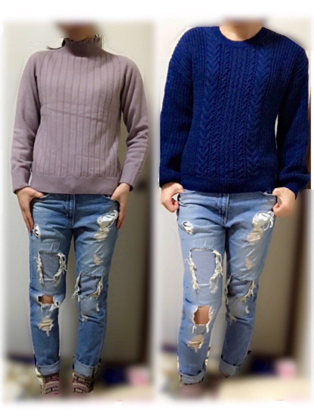 甘めのニット、ゆったりニットにダメージジーンズの組み合わせなんか好き(⑉°з°)-♡ 髪型はポニーテールかニット帽かな🤔