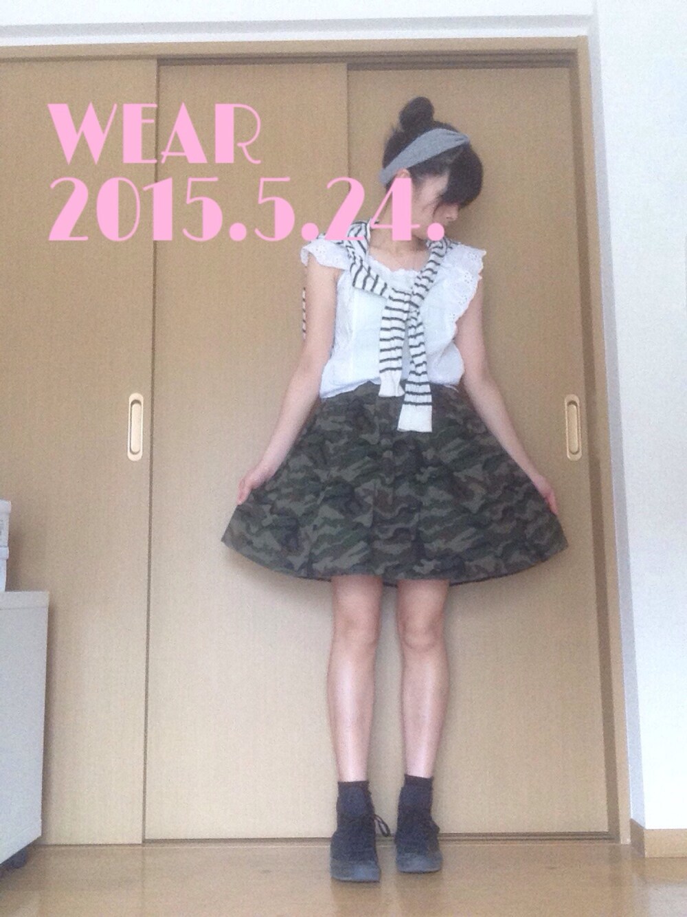 本日のコーデ(◍ ´꒳` ◍) カモフラスカートを久しぶりに着たくて。 白トップスに合わせました♡ 今日は肌寒そうなのでカーデを肩掛け。 足元は黒でまとめましたー! あと久々にヘアバンドしてみました♫おだんごにヘアバンドって合いますね♡ 今日は満腹博覧会?ってのに行ってきますー! 美味しいものいっぱいらしいですヾ(◍'౪`◍)ノ゙楽しみ〜〜 雨降らなそうで良かったです♫