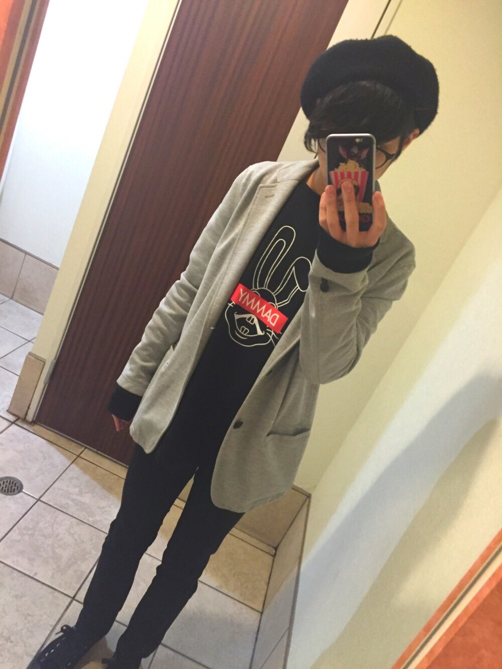 くしゃくしゃな髪の毛はベレー帽で隠す😇😇 ジャケットは昔使ってたやつでなんだか分かりません😔😔