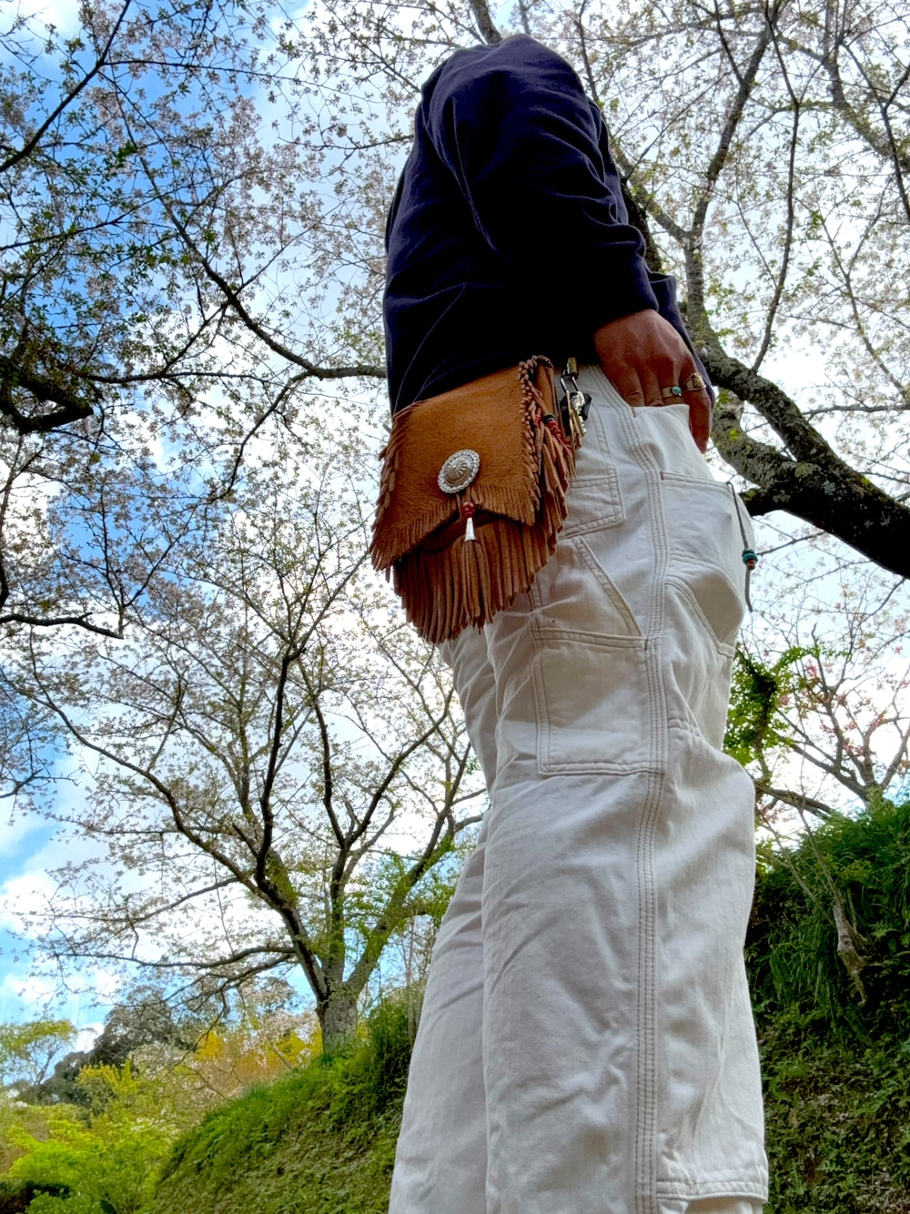 お気に入りはフリーホイラーズのデリックマンホワイトパンツ×goro'sの鹿革フリンジメディスンバック赤茶🤩可愛いすぎる😆 赤茶色が映えるようにコーデを組みました✨