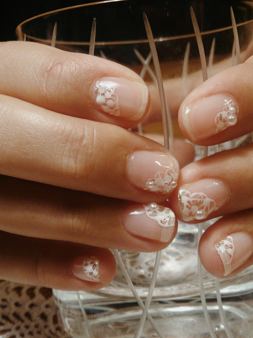 ウエディングネイルです。 ドレスのレースと合わせて、クリアベースに♡