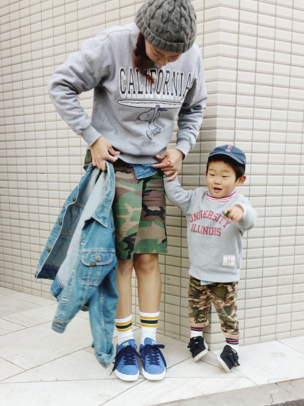 お揃いポイント カモフラ チャンピオンスエット デニムシャツ ラインソックス プーマスエード りんごぼうやとのお揃いコーデはカジュアル感が増します👍