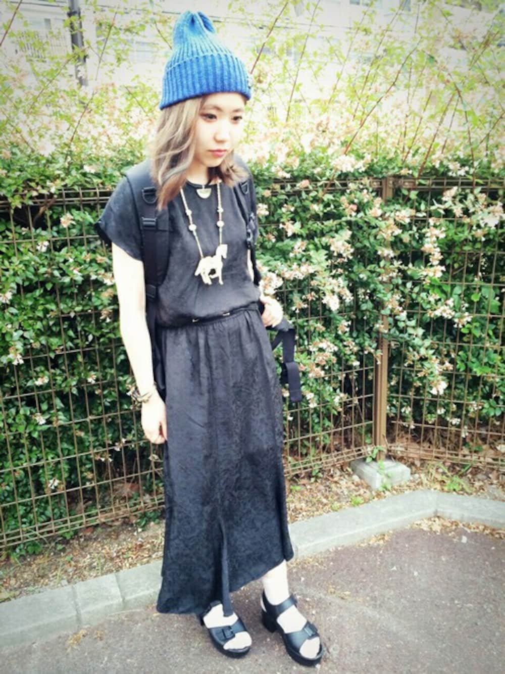 真っ黒なシルクのワンピースに 古着屋さんで一目惚れして衝動買いした 真っ白な馬のネックレスを主役にしたコーデ* 全体が重くなり過ぎないように 足元はフィッシュネットソックスで涼しげに☺︎ ワンピース 古着 ニット帽 SALON ベルト古着 サンダル 古着 リュック NIKE アクセサリー 古着