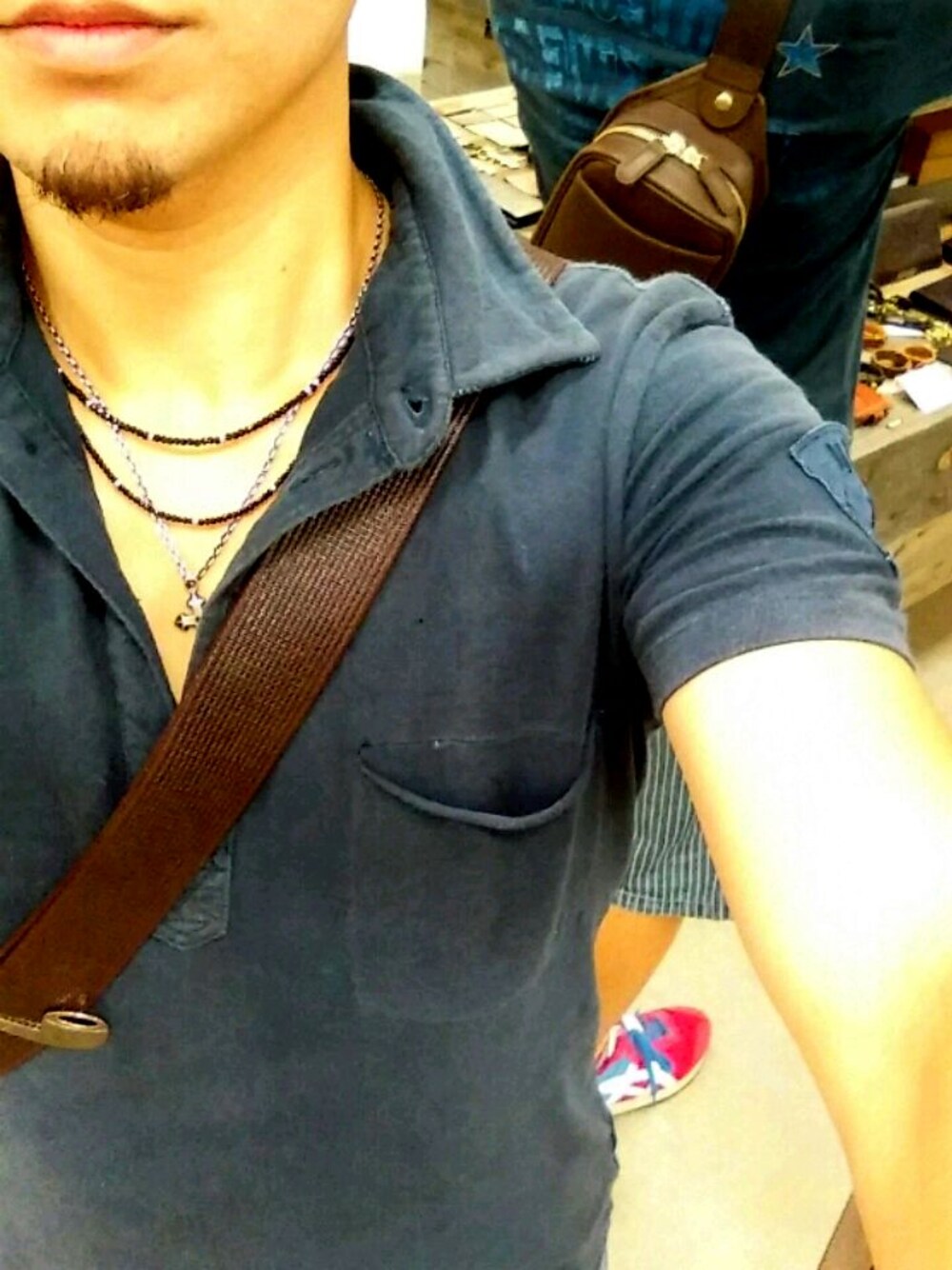 ブックスピネルのネックレス45cm、50cmとクロスのネックレスを3連で重ね付け。 鏡に写ってるボディバッグはショルダーにもなるので使い回し◎
