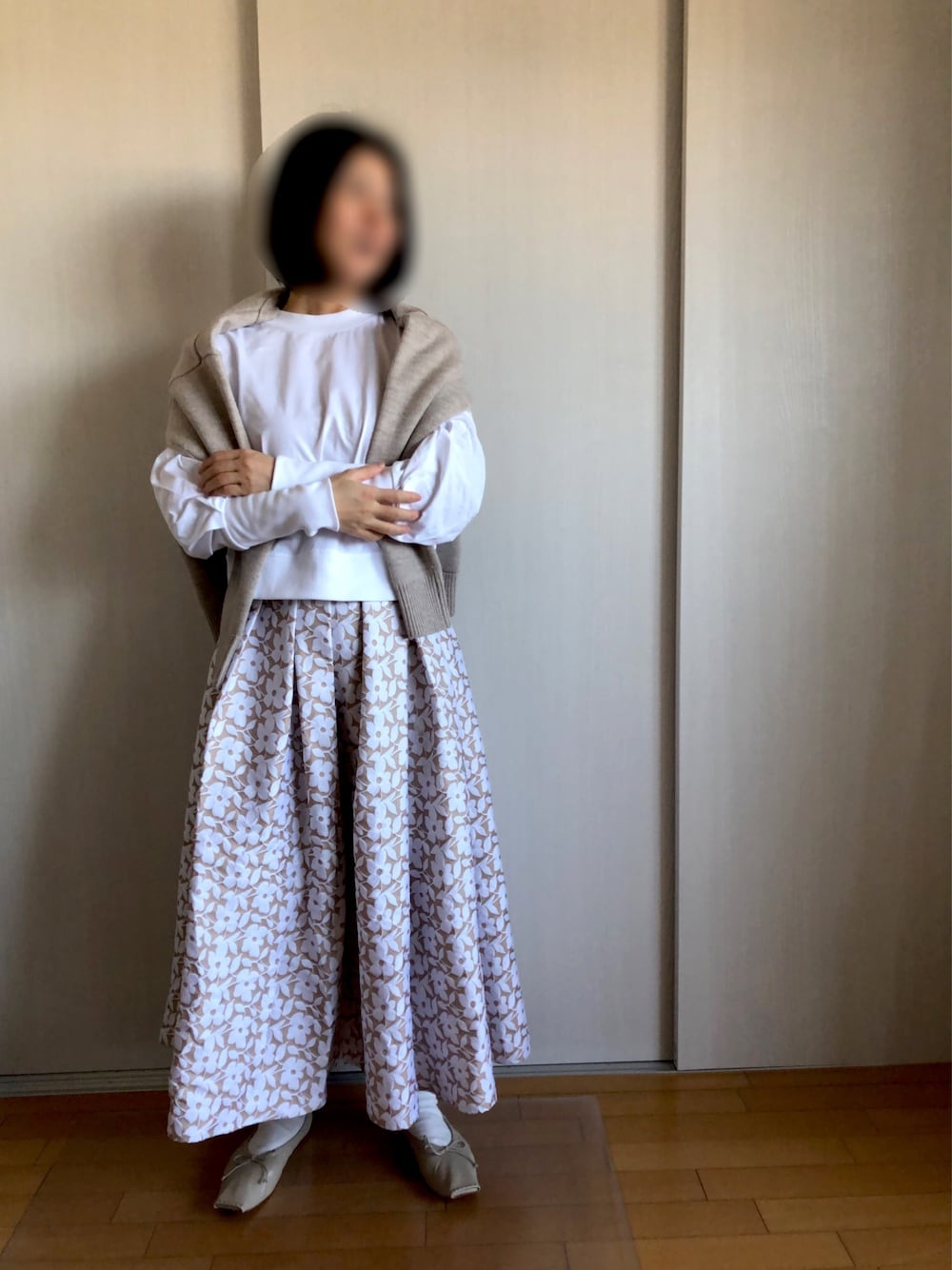 花柄フレアスカートがかわいい ベージュコーデ。 バレエシューズがつかえる。