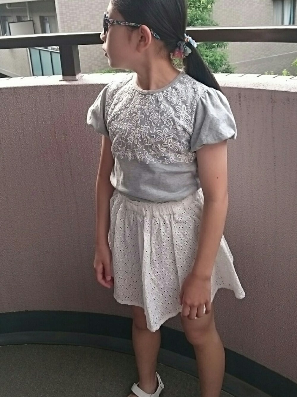 ママとお揃いがあってもいいくらいのテイスト。レースの部分はプリントになってるし、袖はふっくら。シュークリーム?スリーブとか言うんだって。 スカートはレースの生地なんだけど、透けないように下にパンツが付いている。 子供服とはいえよく考えてあるなぁ〜と感心♥