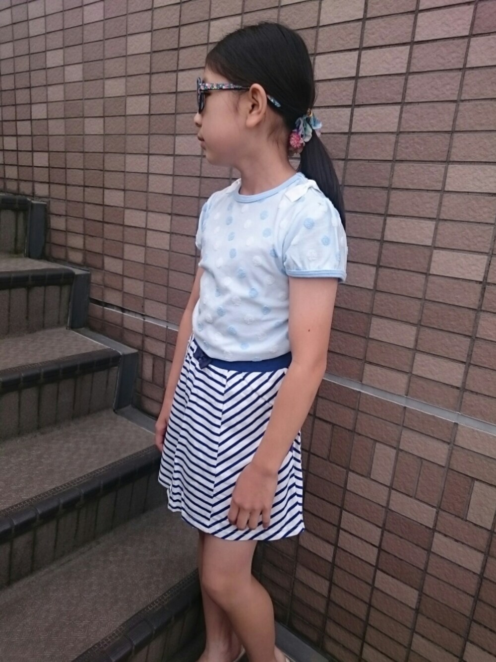 今朝のコーディネートです。無地なんだけど、生地が水玉の模様になっていて素敵です。肩にリボン🎀が付いて女の子にはたまらないみたいです(^-^)vスカートはすがすがしいブルーのボーダーを。 これもスカートの中にパンツが付いています。最近はみんなパンツ付なのね😉