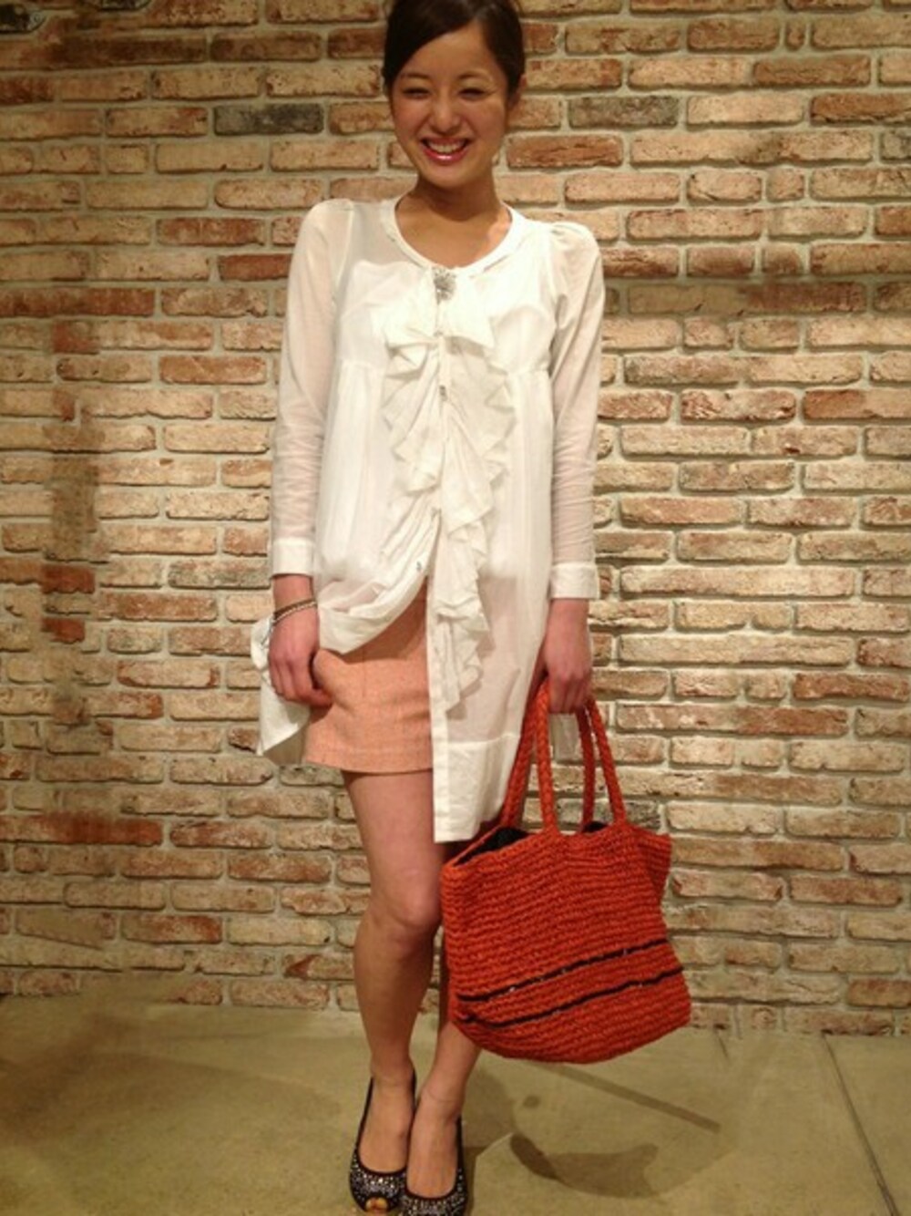 REKISAMI(レキサミ)のフリルブラウスは着丈が長いのでワンピースとして着ても可愛いitem。 透け感があるので、シャーベットカラーのショートパンツを合わせて、少しカラーが透けるのがpointです*