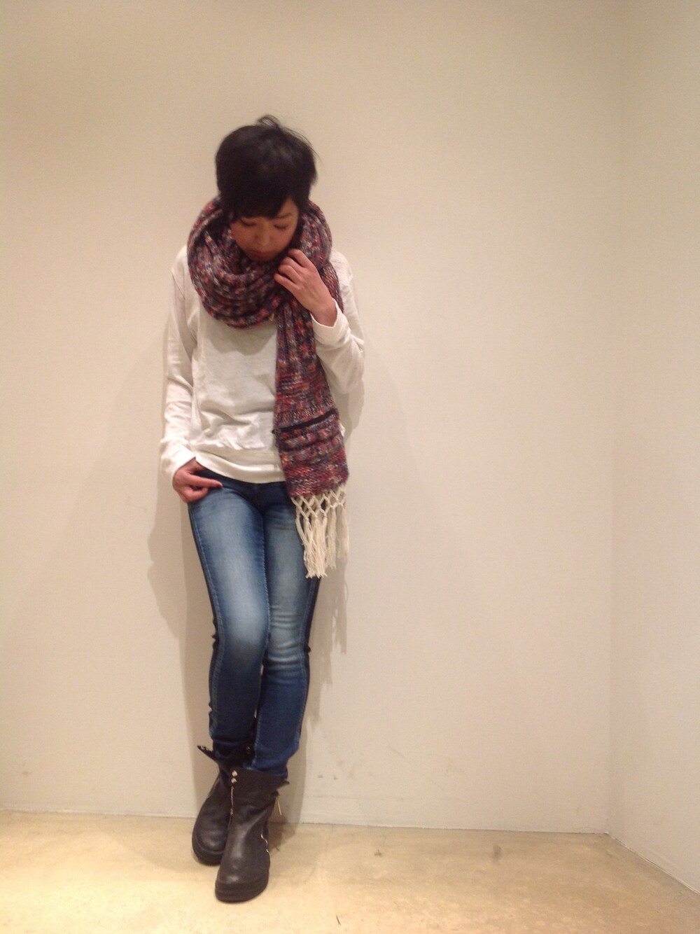 MONROW(モンロー)の バーンアウトトレーナーは、丈感と形がPerfect✨!!スキニーPANTSと合わせてあえてシンプルに…♡tordi(トルディー)のMIXニットストールでアクセントをつけてます◎