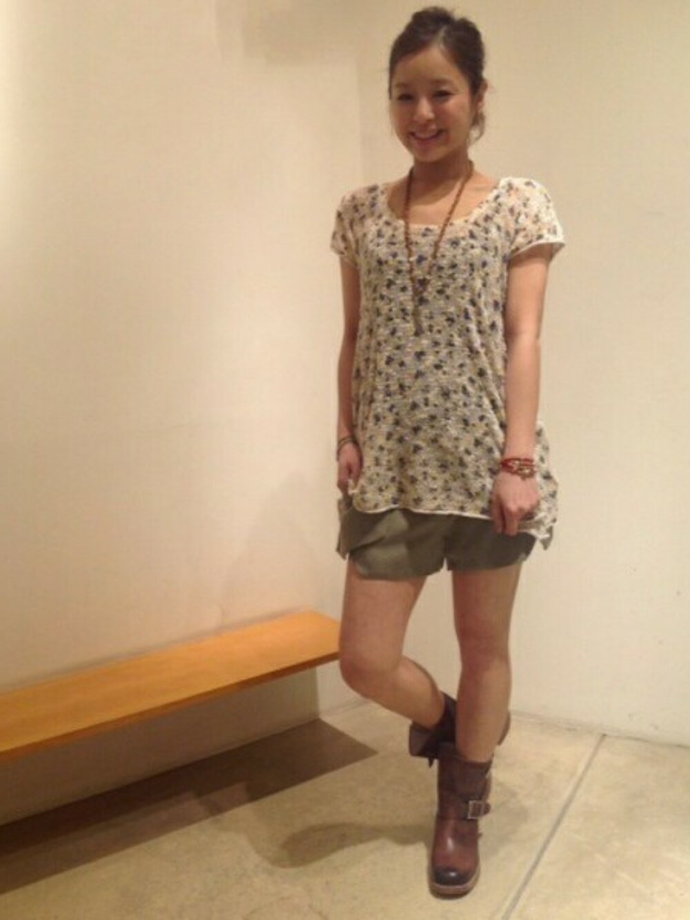 オリーブのの色目が綺麗なFUNKTINAL(ファンクショナル)のショートパンツに、 Free people(フリーピープル)の小花柄ニットを合わせてやわらかい印象になるようにまとめました♪ 単色コーデは、足下に濃い色を持ってくると締まってみえるので◎