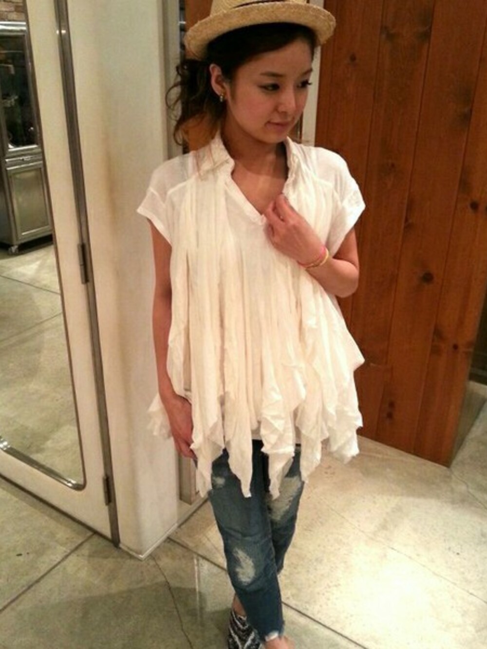 REKISAMI(レキサミ)のフリルブラウスは、カット地とシャツ生地が組合わさったデザインがお洒落な一枚* 着るだけで華やかに見えるので、ボトムはデニムで◎ Chiristy'sの麦わらHATでカジュアルさと夏らしさを+しました* 襟は取り外しが出来て、ノーカラーにするとガーリーなイメージになります♪