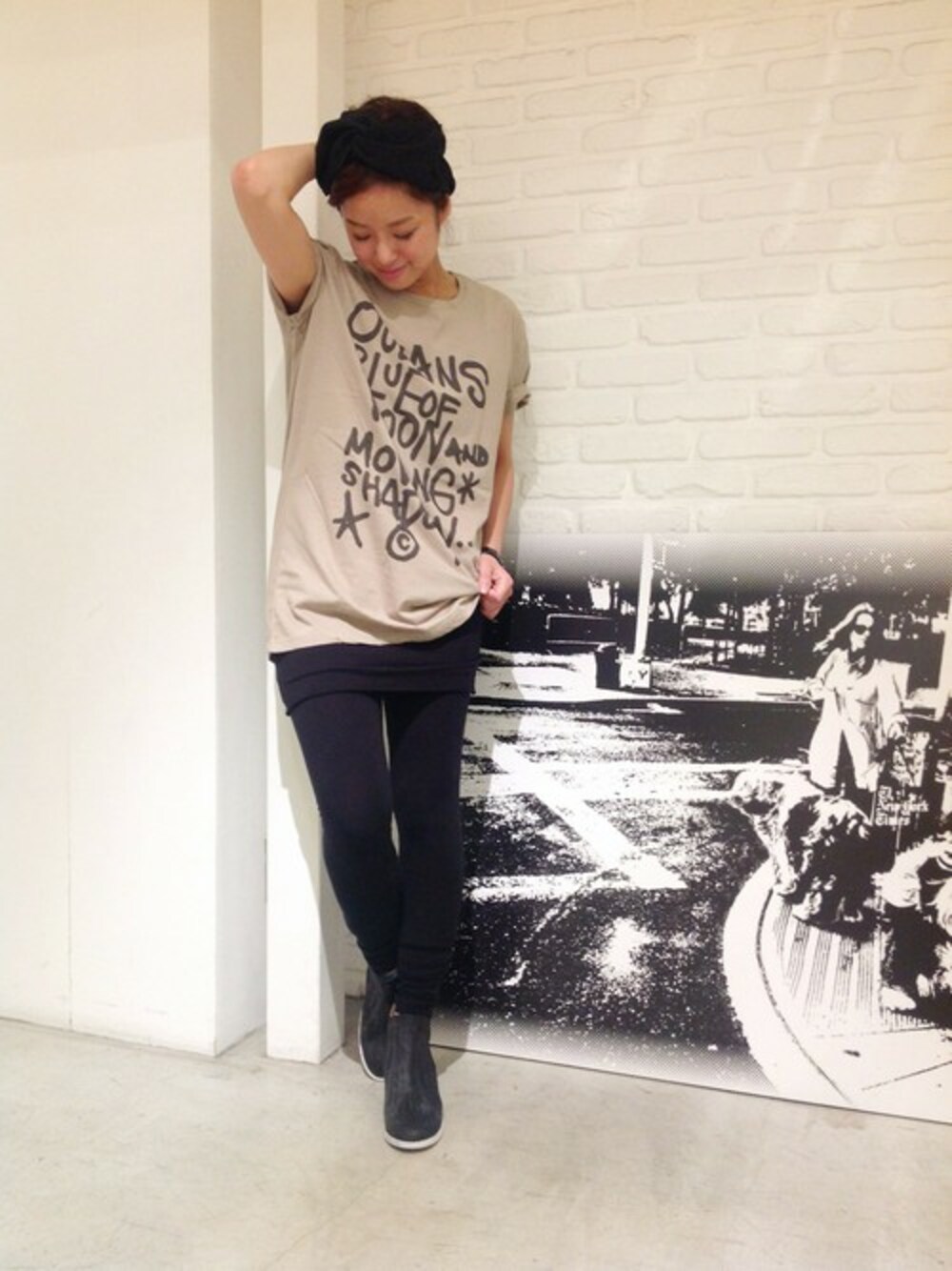 Caie(カイエ)のbigシルエットのTシャツにレギンスを合わせてチュニック風に着るのがお気に入り〜♥︎♥︎♥︎ 小物も全てblackで統一してcoolなスタイリングに♪