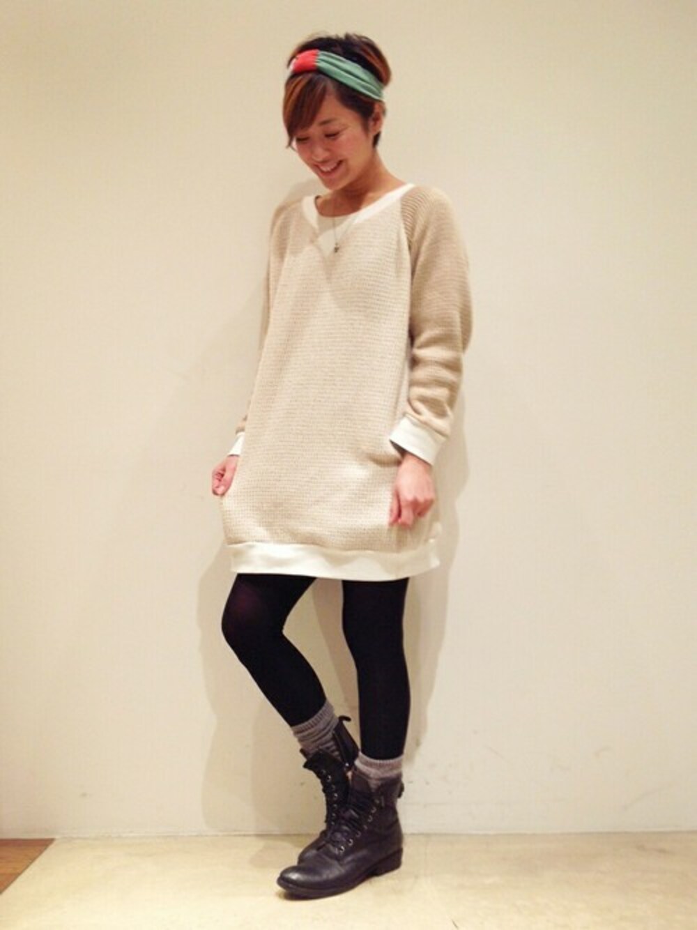 春っぽいColorがのCaie(カイエ)のラグランニット♬🎶 そのままワンピで着るのがお気に入り♡ FRYE(フライ)のレースアップブーツは、ヴィンテージ感が絶妙♔黒が多くなりがちなので、ベージュのニットで春を先取り~!!