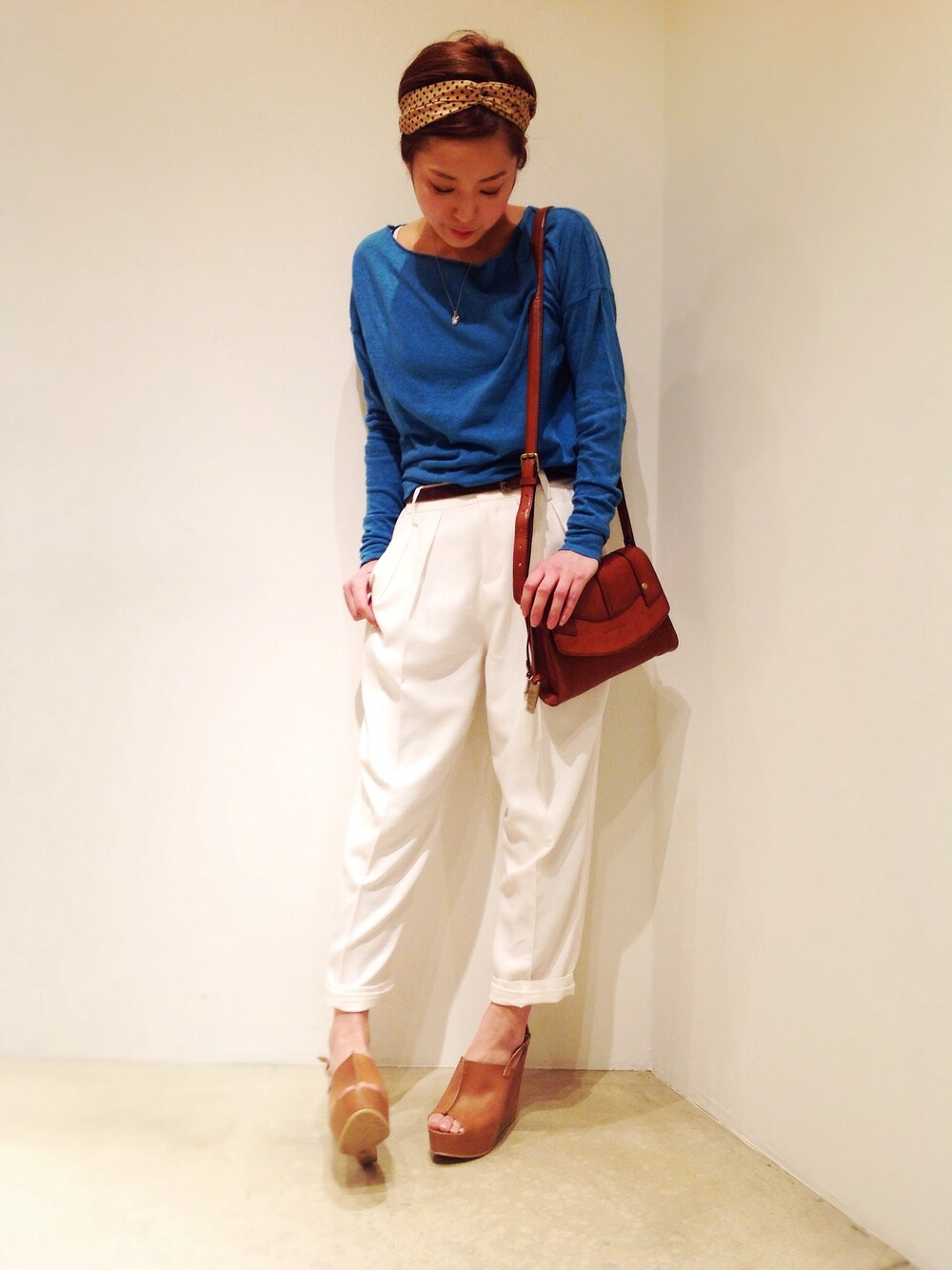 Vroom(ブイルーム)のブルーのカットソーにハイウエストのパンツを合わせて春の❁レトロコーデ❁ 小物は、ブラウンで統一して雰囲気がやわらかくなるようにしました♡♬