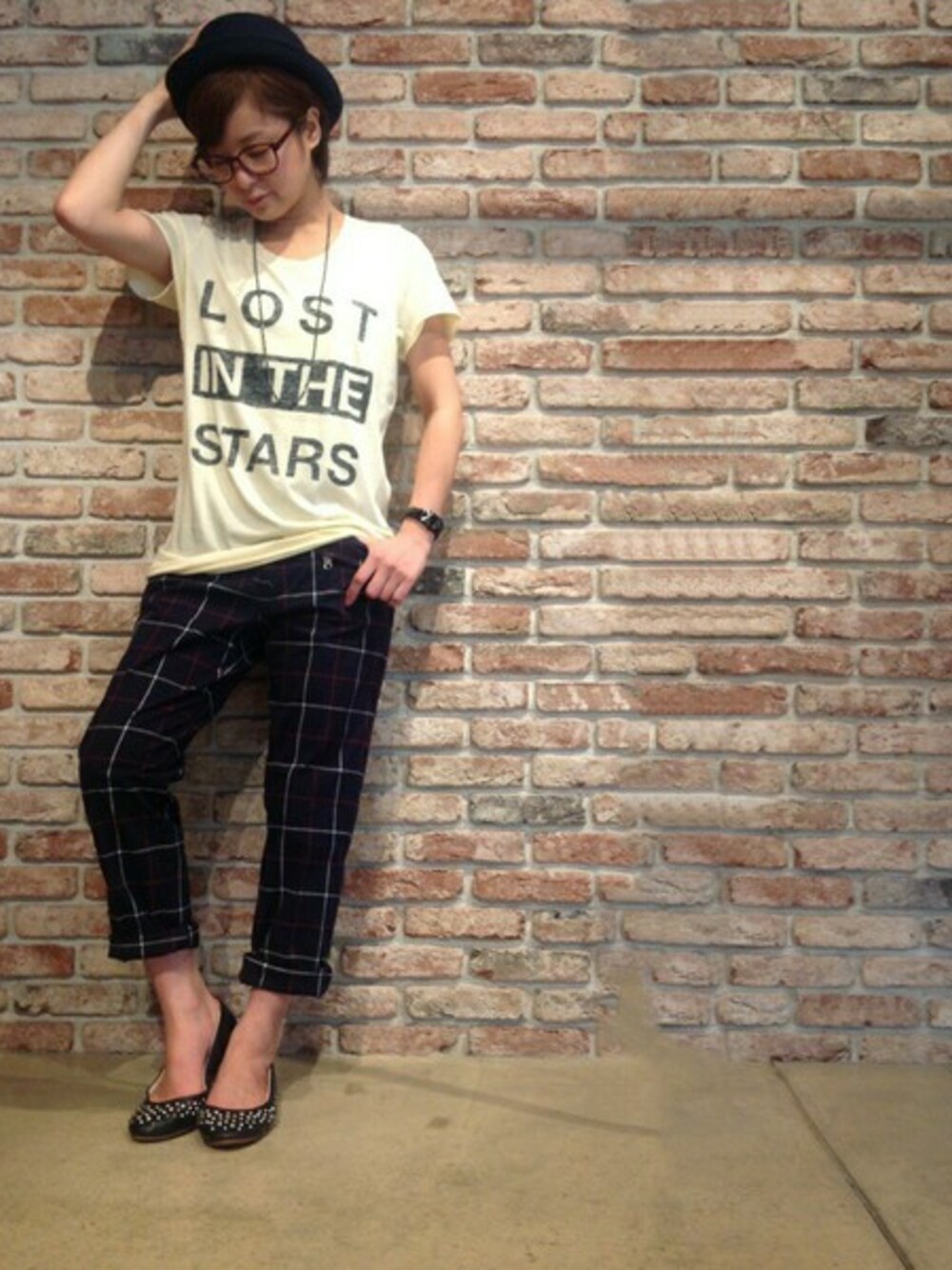 柔らかいレモンイエローが、コーディネートの差し色になるTシャツは、 人気ブランドZOE KARSSEN(ゾーカーセン) チェックパンツ+ボーラーHATでマニュッシュに合わせました* 足下をブーツに変えてライダースジャケットを上から羽織れば秋コーデの完成です◎