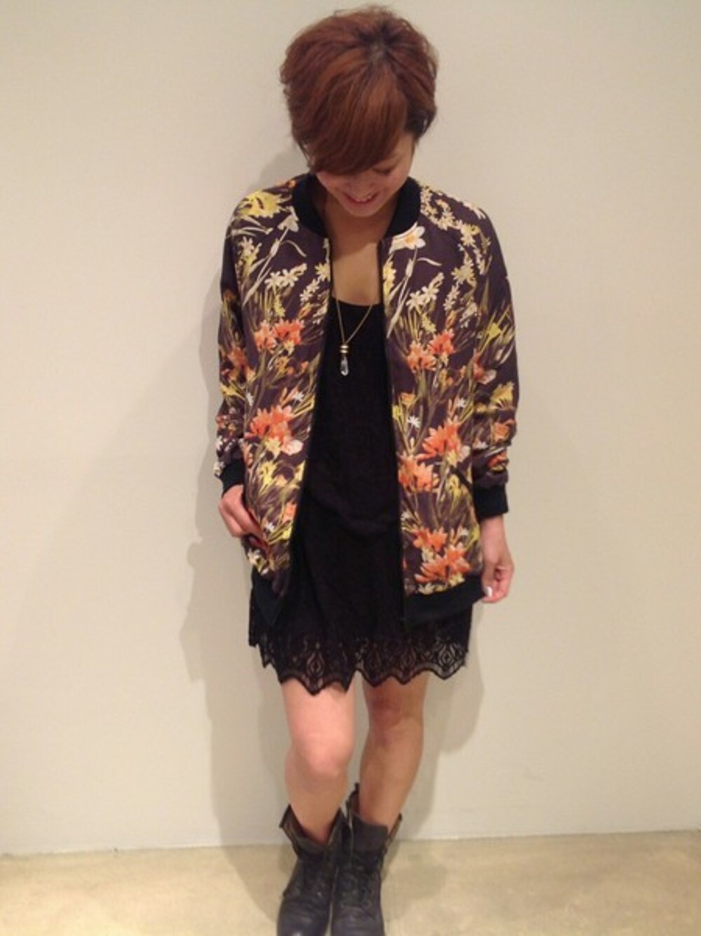 ガーリーなCaie(カイエ)のチュニックに、ストリート感たっぷりのSomeday's(サムデイズラヴィン)の ブルゾンを合わせたmixコーデ♡ 花柄がブラックベースなので、クロのitemでまとめて統一感を出しました◎
