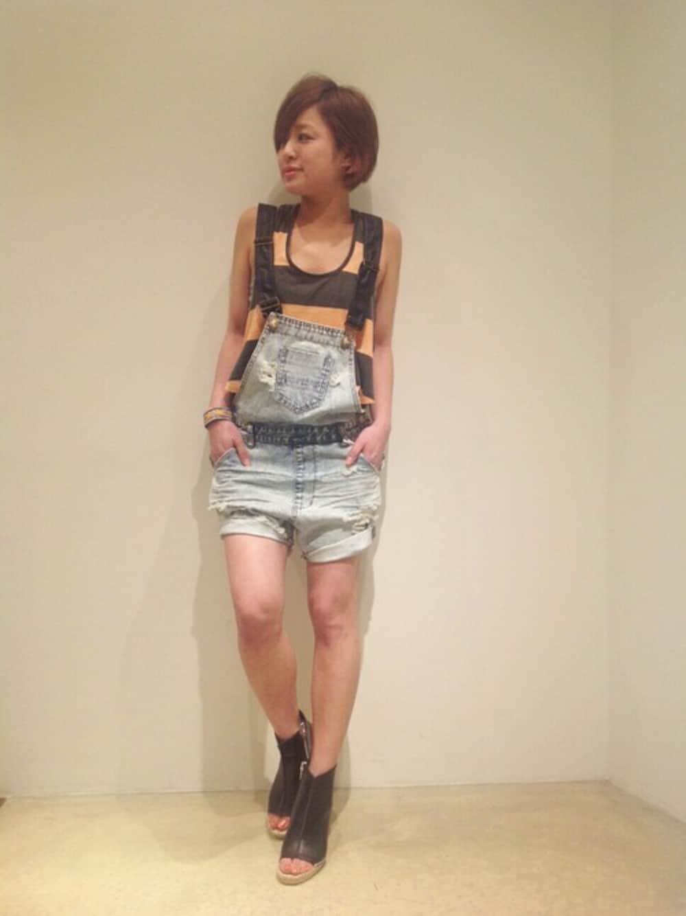 One tea spoon (ワンティースプーン)のデニムサロペット はヴィンテージ加工とクラッシュがPOINT♡ 中にはpeopleVSのボーダータンクでやんちゃに☆★ 子どもっぽくなり過ぎないように、足元はヒールで合わせました!