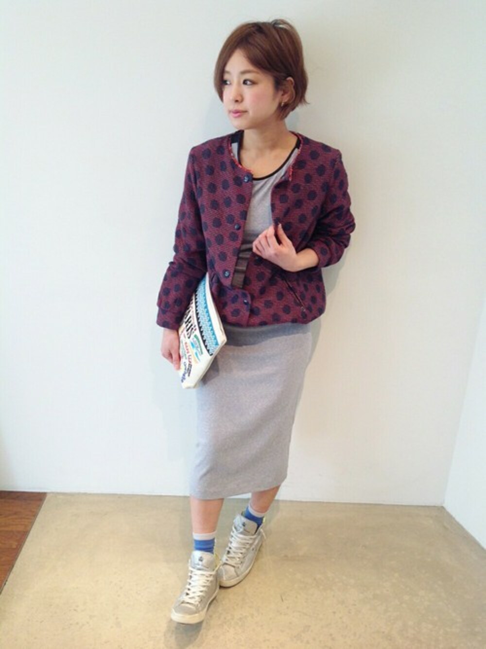 ADDISON (アディソン)のワンピースは首元のパイピングがスッキリと見えるPOINT!! ottdAme(オットダム)のドット柄のジャケットは、少しオーバーサイズなので、タイトなシルエットのモノに羽織るとバランスも◎♪♪