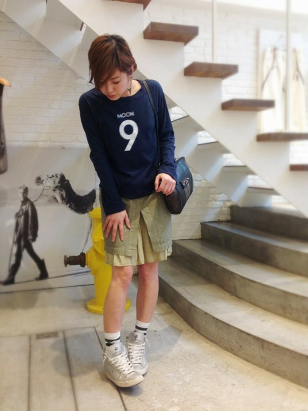 9 のプリントが可愛いCaie(カイエ)のロングTシャツ♡ 長すぎないので、トレンドの膝丈スカートにもバッチリ◎♬ LEATHER CROWN(レザークラウン)のスニーカーは どんなstylingにも合う万能SHOES✨!!