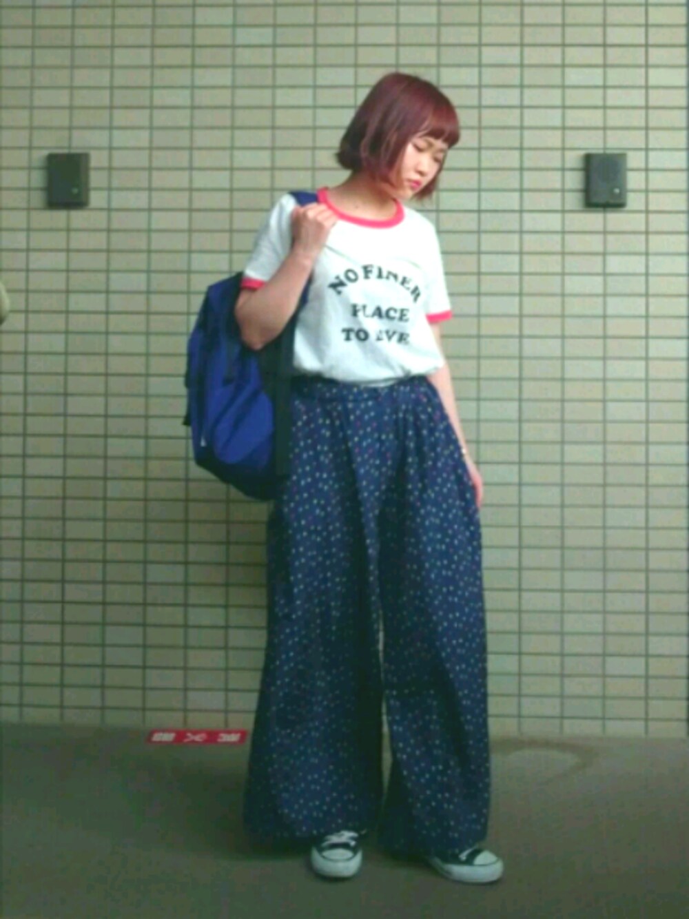 通学にはシンプルで動きやすいコーデがすき :) Tシャツは1年前くらいに、GUで買ったもの✨ 安かったのに合わせやすいデザインでお気に入りです❤