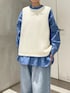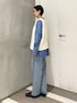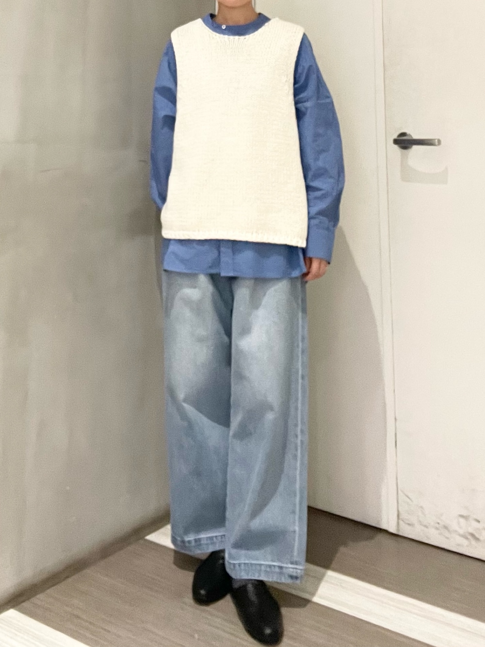 アイボリー×ブルーのやわらかな色合わせ。 淡いトーンでまとめて 春らしい雰囲気にしました○ シンプルながら 素材の風合いが引き立つスタイリングです。 足元は黒のバブーシュで さりげなく引き締めました。