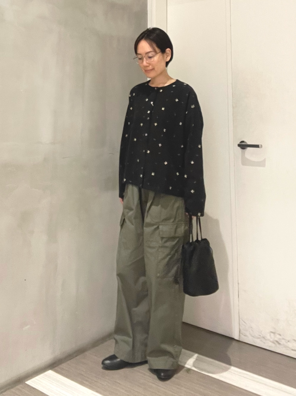 黒×カーキコーデ。 ツバメ刺繍が目を惹くブラウスにメンズライクなボトムスを合わせました。 甘さをほどよく抑えた大人カジュアルです○