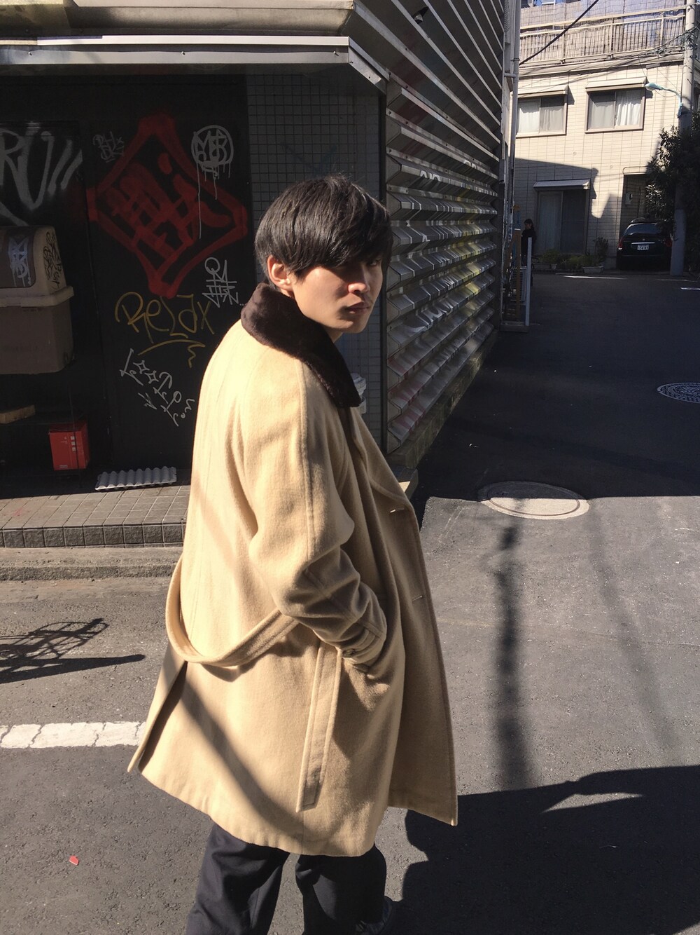 ブラック系のスラックス、ベージュ系のその他アウターを着用したメンズの春コーディネートの1枚目の写真