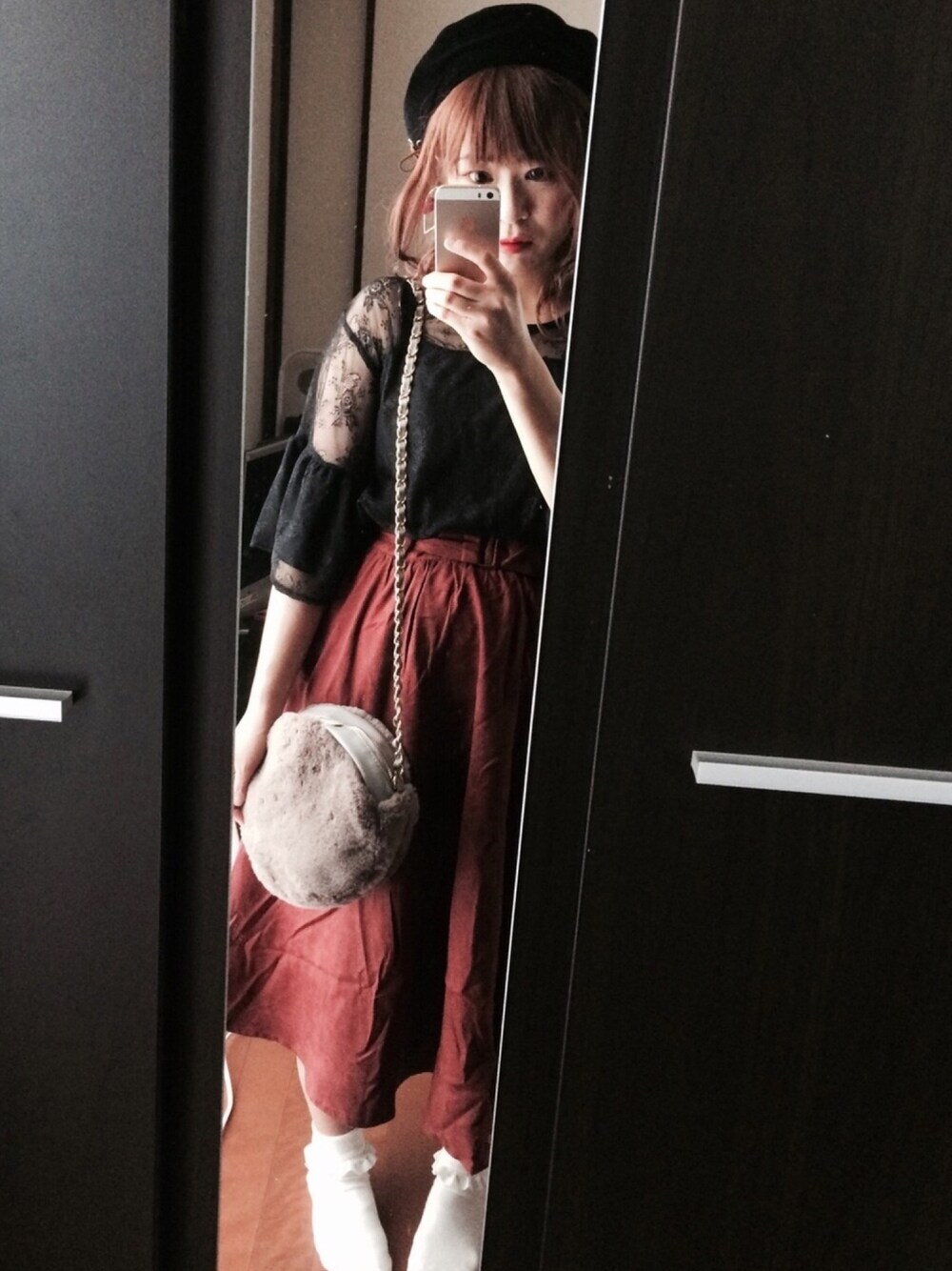 数日前のコーデ。 8月ですが秋物見てると着たくなる! レースのトップスは着回し抜群です! そして、新作のファーバッグは肌触りもよても良くて長財布も入る優秀バッグです。