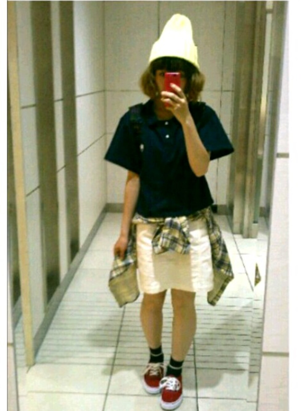 ポロシャツの柄、実はリンゴに手と歯が… 一目惚れでした♥ 腰に巻いてるチェックシャツは旦那に買ったけどサイズが小さくて着れなかったのであたしが使うことにしました(^^;;