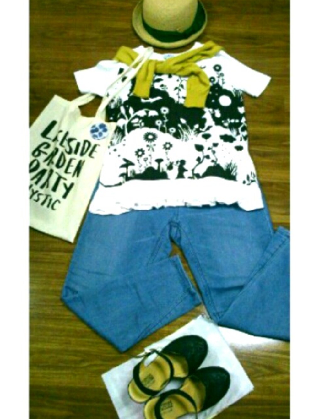 トップス/KAREN WALKER パンツ/snidel 帽子/emフルール 夏したいコーデ♡ 子供の寝かしつけがはやく終わったから初の平置きやってみた(・∀・) 子供達いると1秒でバラバラだ~笑 緑×黄色をポイントに♥