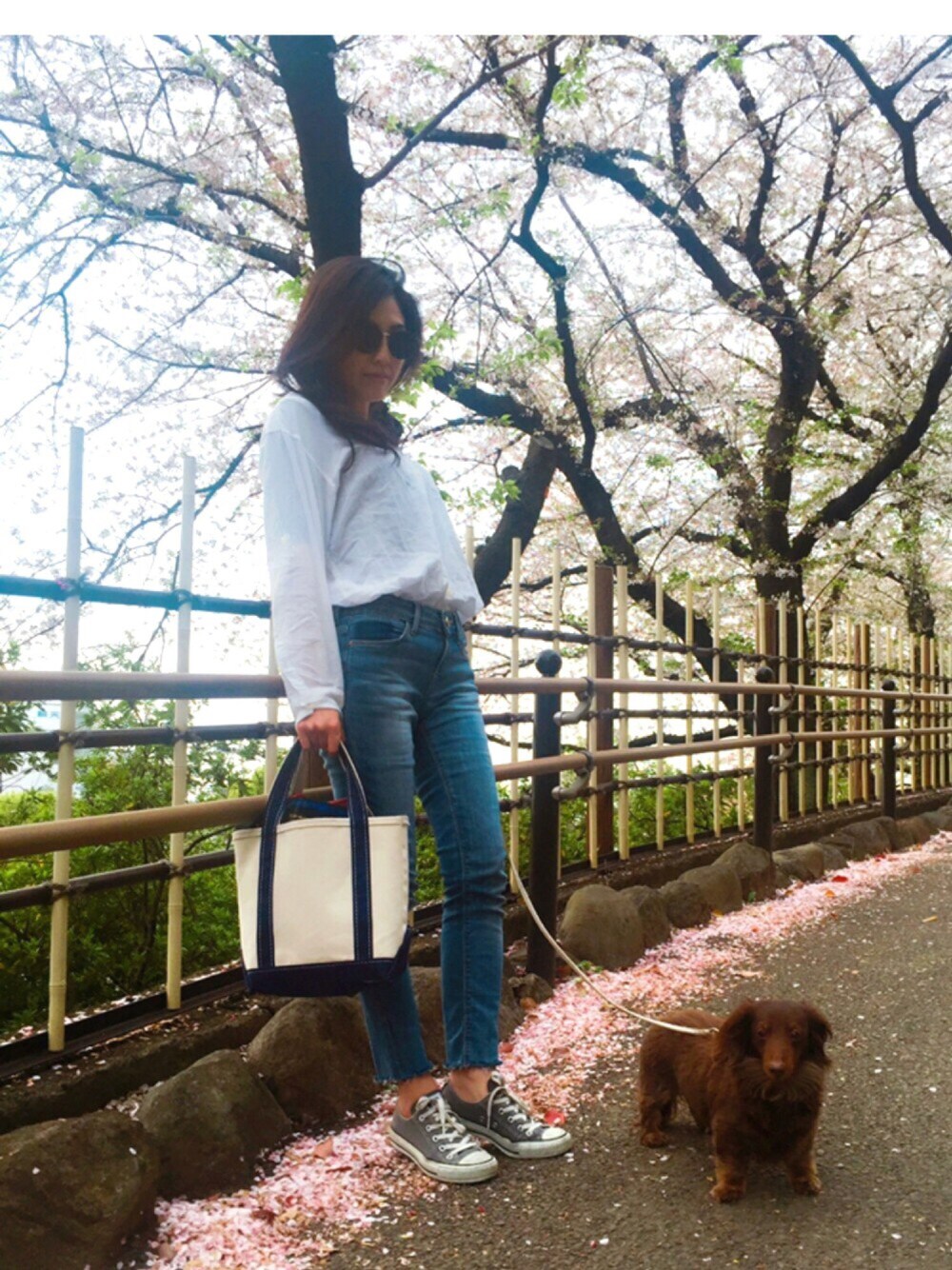 最後のお花見に🌸 アクセがほぼ見えない🙈💦💦 シンプルにシャツにデニム🐶💗