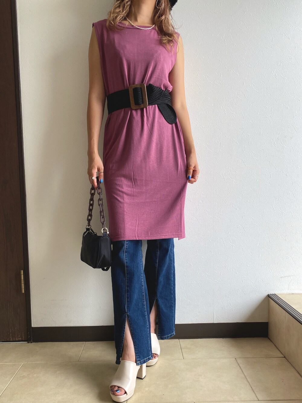 ご覧頂きありがとうございます♡ ピンクのノースリチュニックに フレアパンツを合わせたスタイリング💓