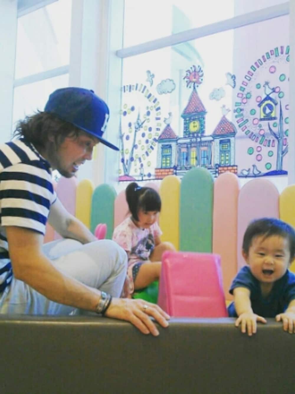 ショッピングモールの子供広場で遊ぶ夜勤明けで一睡もしない血色の悪い大人カジュアルコーデ☆ いつも見てくれて、ありが㌧☆ Thank You~☆☆☆
