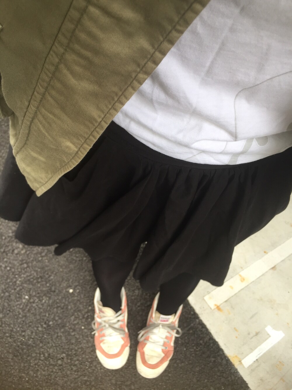 秋って感じの天気🎶 maー1風のカーキジャケットに、 白T、黒スカートのシンプルcode