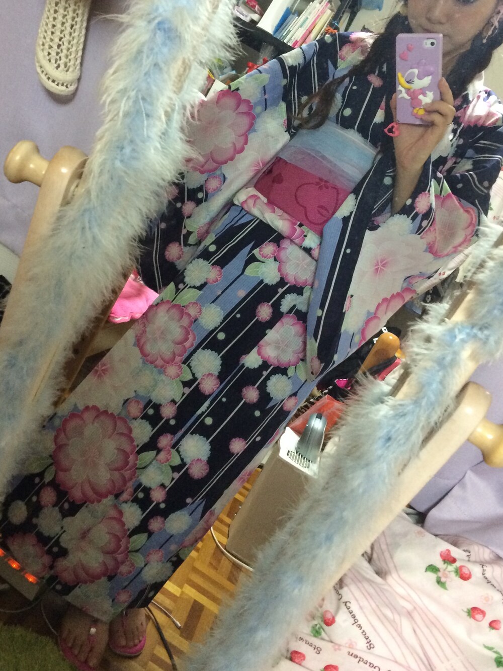 妹が作った浴衣(^ω^) 自分で着れるけど、帯が出来なくて作り帯(。-_-。)