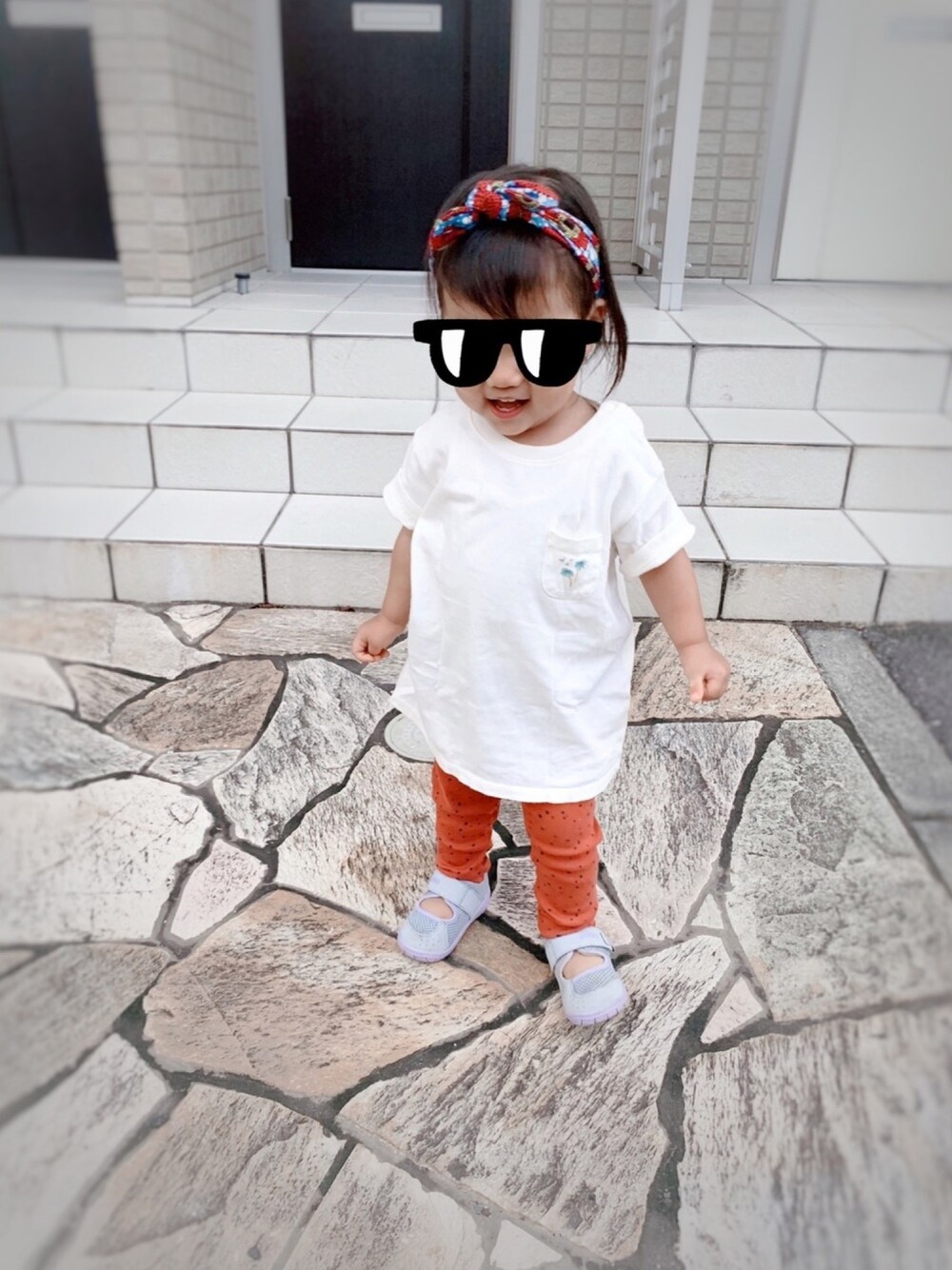 おさがりのヘアバンドが可愛い& 長さ調整できて使いやすい♡ 去年買ったUNIQLOTシャツも、 椰子の木が可愛くてお気に入り〜🏝