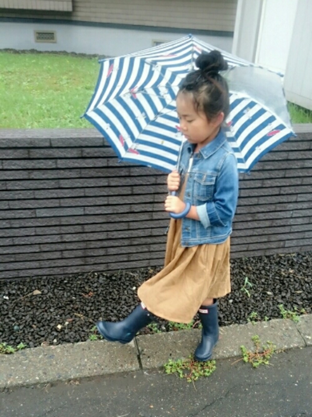 朝から雨☔まだ、霧雨だけどこれから、 降りそう…。 コーデュロイのスカートのボリュームが可愛いです♥ Tシャツと傘は、スヌーピー☺