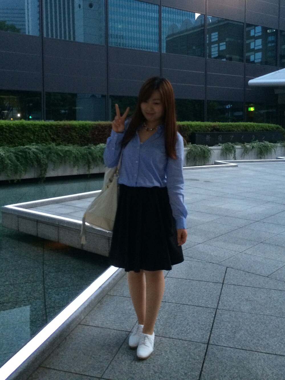 チェックシャツからブルーきれいめシャツに変えた♡ ビジューネックレス、お高いからきらっきら!女子度上がるわー(´∀`人) カバンはリュックにもなる優れもの♡