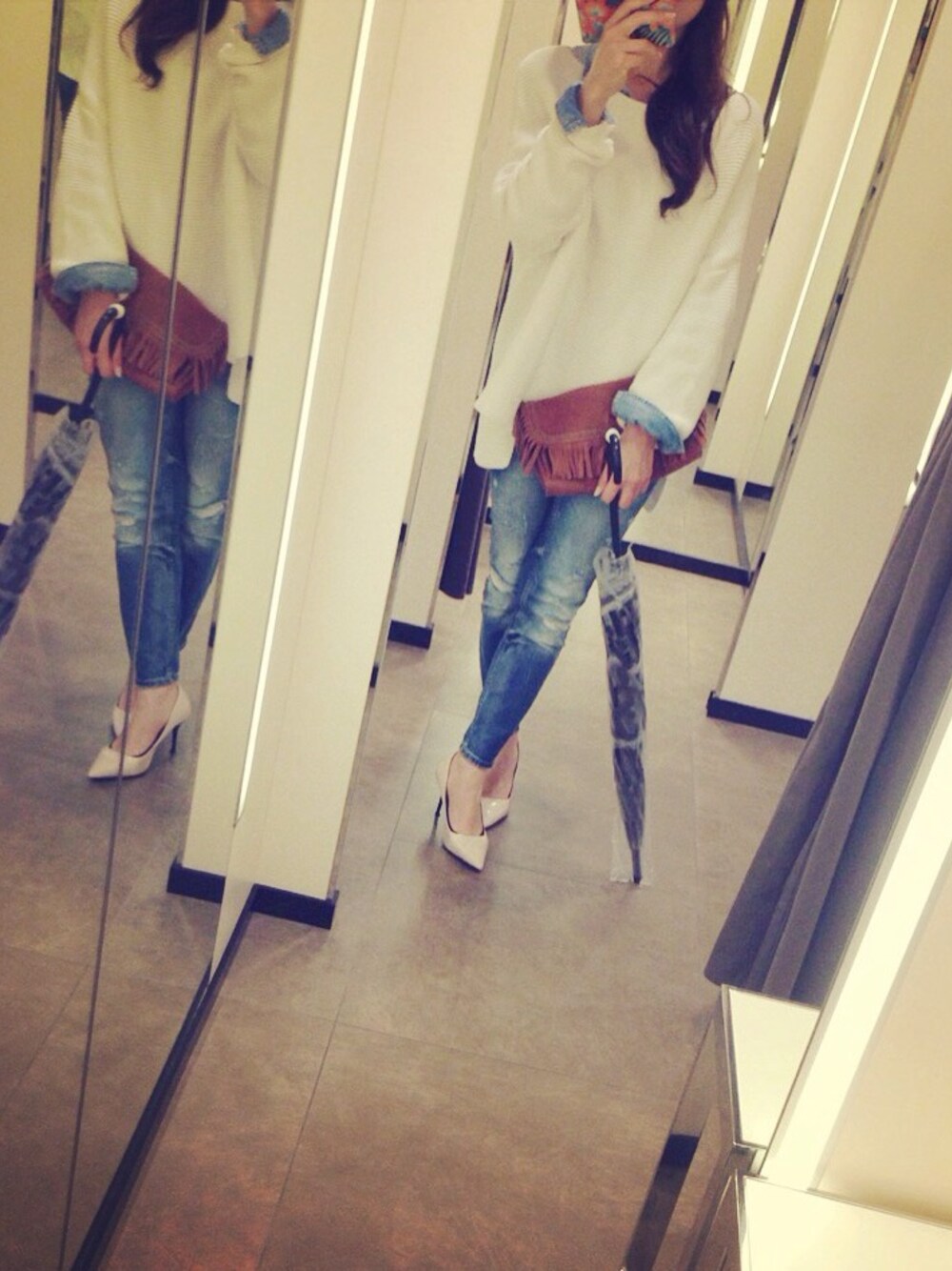 ホワイト系のニット/セーターを着用したレディースの冬コーディネートの1枚目の写真